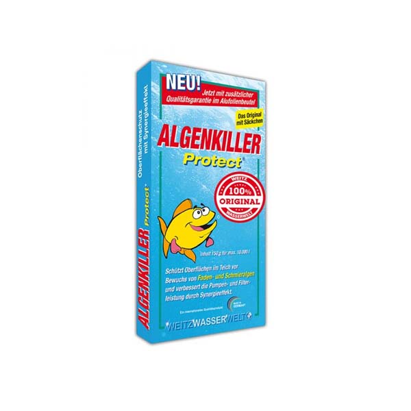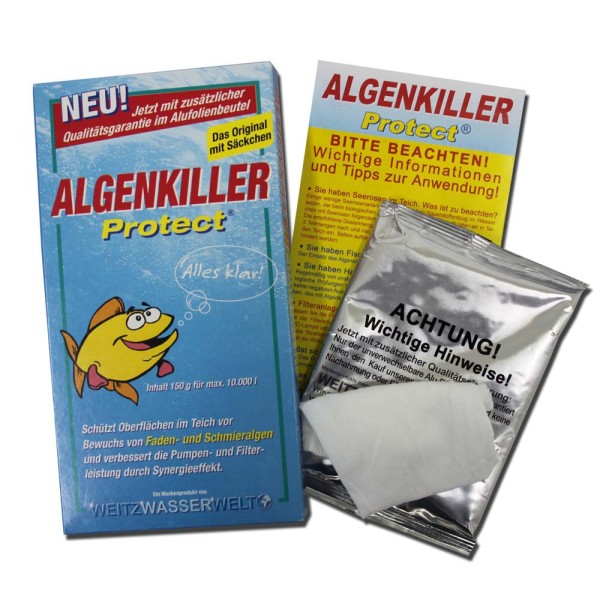 To Algenkiller protect είναι αλγοκτόνο και καταπολεμά την άλγη(όπως επιπλέοντα νηματώδη κ.α καθώς επίσης και τη δυσοσμία που προέρχεται απο την άλγη.Μειώνει τη φωτοσύνθεση των αλγών και δρα για μεγάλο χρονικό διάστημα. Τα άλγη πεθαίνουν και στη συνέχεια αποσυντίθεται απο τους μικροοργανισμούς. Επίσης βελτιώνει την απόδοση των αντλιών και των φίλτρων της λίμνης, προστατεύοντας τα.