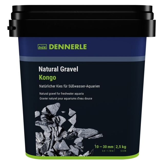 Το Natural Gravel Kongo είναι ένα φυσικό σπασμένο χαλίκι από σκούρο γκρι σχιστόλιθο. Είναι ιδανικό, για παράδειγμα, για να παρέχει ένα σχέδιο με αντίθεση για ένα υδάτινο τοπίο με τις πράσινες αποχρώσεις των υδρόβιων φυτών. Οι τόνοι, τα μικρά μονοπάτια ή ολόκληρα τοπία μπορούν να σχεδιαστούν με το γωνιακό, σκούρο χαλίκι – δεν υπάρχουν όρια στη δημιουργικότητα. Με το 100% φυσικό χαλίκι, το οποίο έχει σχεδιαστεί σύμφωνα με ένα βιότοπο στο Κονγκό, μπορούν να πραγματοποιηθούν εντυπωσιακά σχέδια.