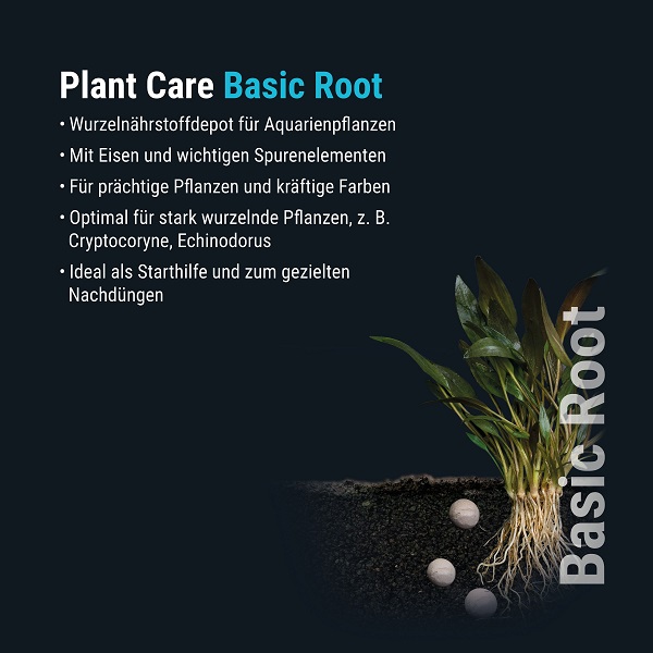Το Plant Care Basic Root είναι η καθολική αποθήκη θρεπτικών ουσιών με βάση τον άργιλο για όλα τα φυτά ενυδρείου που προτιμούν να απορροφούν τα θρεπτικά συστατικά τους μέσω των ριζών. Βοηθά τα νεοφυτεμένα φυτά να αναπτυχθούν, ενώ στα μεγαλύτερα φυτά δίνεται φρέσκο σθένος.