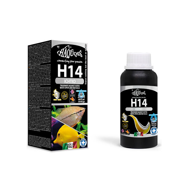 To ichtyo είναι μια ασθένεια που μεταφέρεται από ένα παράσιτο (βλεφαριδορφόρο πρωτόζωο ) που ονομάζεται Ichthyophthirius multifiliis και επηρεάζει τόσο τα ψάρια του γλυκού όσο και του αλμυρού νερού, κοινώς γνωστή ως «ασθένεια των λευκων κηλίδων». Η κύρια αιτία είναι η αλλαγή θερμοκρασίας στο ενυδρείο ή κατά τη μεταφορά των ψαριών. Από τη στιγμή που το παράσιτο προσκολλάται στο ψάρι μέχρι την εκκόλαψη των κύστων, περνούν περίπου τέσσερις ημέρες. Εξαιτίας αυτού, το ichtyo είναι πολύ μεταδοτικό και τα ψάρια πρέπει να παρακολουθούνται προσεκτικά. ΣΥΜΠΤΩΜΑΤΑ: Λευκές κηλίδες σε όλο το σώμα – Απώλεια όρεξης – Δύσπνοια λόγω των βραγχίων που κινούνται πιο γρήγορα από το κανονικό – Τάση για κολύμπι κοντά στην επιφάνεια – Κόκκινα βράγχια – Τάση για τρίψιμο στην επιφάνεια της διακόσμισης – Ακανόνιστο κολύμπι – Πτερύγια που κολλάνε στο σώμα. Το Haquoss H14 είναι ένα ειδικό προϊόν για αυτόν τον τύπο καταστάσεων και θα πρέπει να χρησιμοποιείται μόλις εμφανιστούν τα πρώτα συμπτώματα. Αφαιρέστε το φίλτρο ενεργού άνθρακα, εάν υπάρχει, και αερίστε καλά το ενυδρείο. Το νερό θα γίνει μπλε-πράσινο κατά τη χορήγηση αλλά αυτό είναι φυσιολογικό. ΣΗΜΑΝΤΙΚΟ: Τα ασπόνδυλα και τα καρκινοειδή δεν μπορούν να ανεχθούν αυτό το προϊόν. Σκιάστε το ενυδρείο κατά τη διάρκεια της θεραπείας.