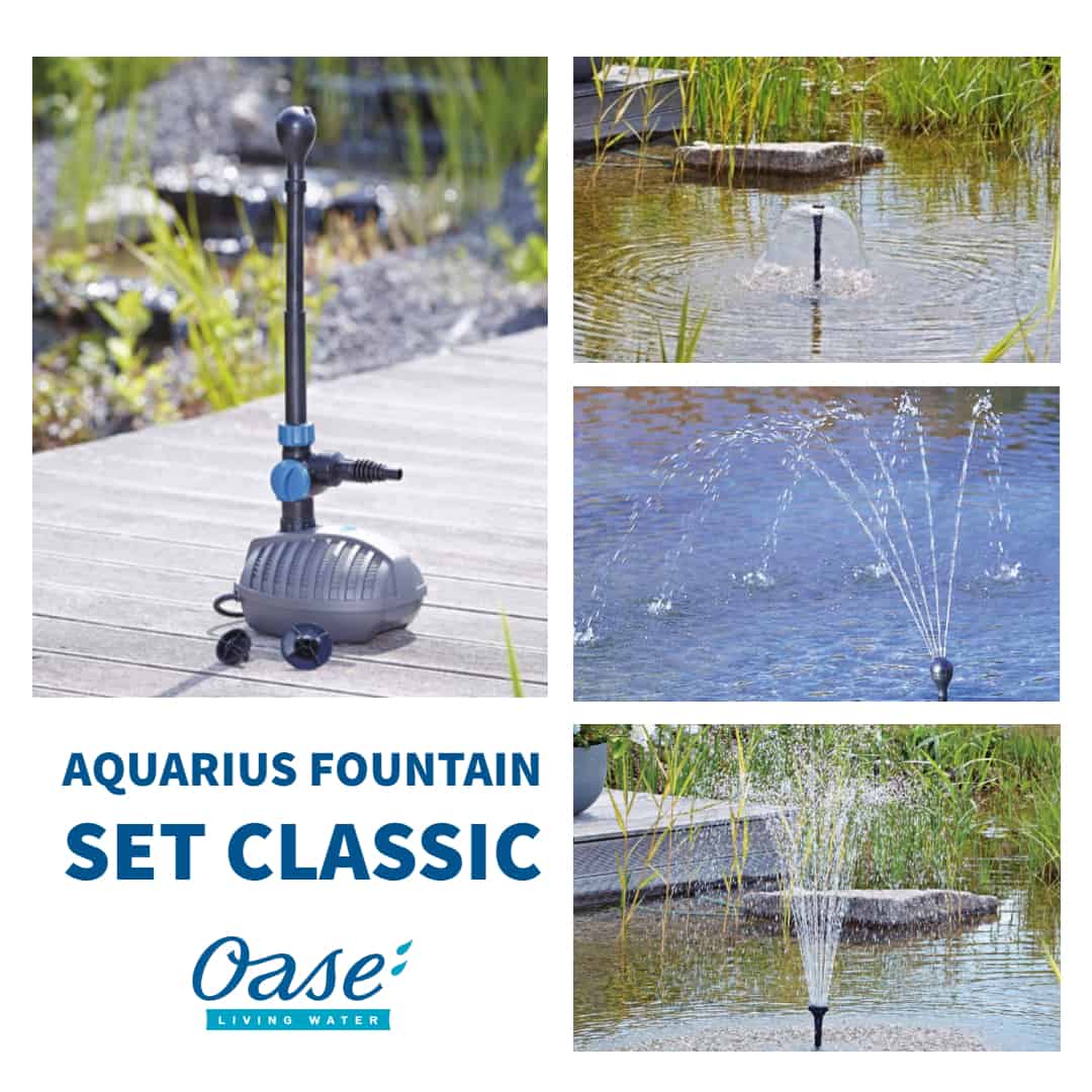 Η σειρά Aquarius Fountain Set Classic διαθέτει αντλίες σιντριβανιών με ρυθμιζόμενο τηλεσκοπικό σωλήνα και με δυνατότητα προσαρμογής διαφορετικών ακροφυσίων. Διαθέτει θερμικό κάλυμμα προστασίας της αντλίας και είναι κατάλληλη μόνο για τοποθέτηση εντός του νερού. Διαθέτει σταθερή βάση για καλύτερη εγκατάσταση στον πυθμένα του υδάτινου στοιχείου.