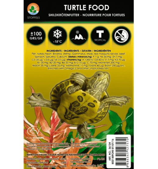 Μείγμα για χελώνες. Είναι φτιαγμένο από ψάρια, γαρίδες, gammarus, mysis, προνύμφες κουνουπιών, σπιρουλίνα, ασβέστιο… Η συσκευασία μπλίστερ των 100 γραμμαρίων έχει μια χρωματιστή πλάκα κάλυψης σε σχήμα μανικιού που προστατεύει μια κυψέλη που περιέχει 30 τροφικά κύτταρα.