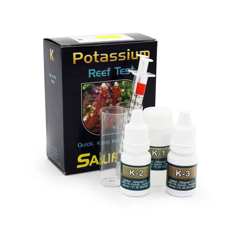 H συγκέντρωση καλίου σε φυσικό θαλασσινό νερό είναι περίπου 400 ppm. Πολλοί χομπίστες έχουν αναφέρει ότι η χαμηλή τιμή του καλίου μειώνει τα χρώματα στα κοράλλια. Αυτό μπορεί να διορθωθεί με την αύξηση της τιμής του καλίου στην κανονική φυσική συγκέντρωση. Τώρα μπορείτε να μετρήσετε με ακρίβεια την τιμή αυτή με τα νέα πακέτα Salifert κάλιο Reef Test.