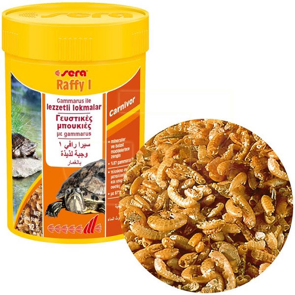 Το sera Raffy I Nature είναι γευστικές μπουκιές χωρίς χρωστικές και συντηρητικά για χελώνες νερού και άλλα (περιστασιακά) σαρκοφάγα μικρότερα ερπετά και αμφίβια. Αποτελούνται από φυσικά, ήπια αποξηραμένα gammarus (43.5%), shrimps (43.5%), μικρά ψάρια και krill.