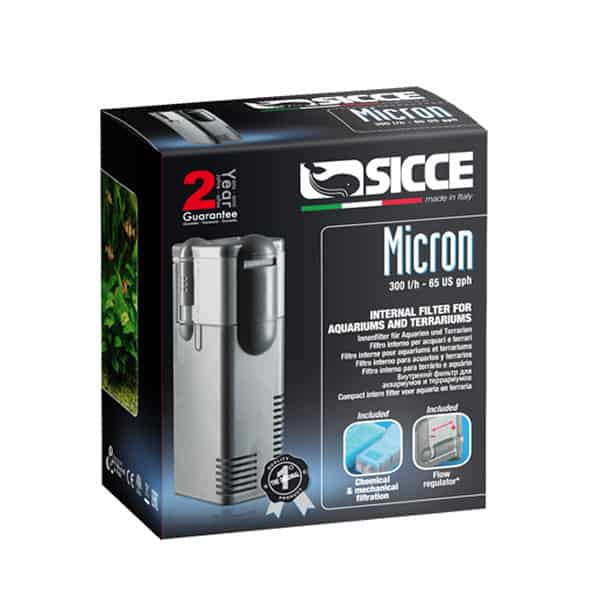 NANO MICRON and MICRON are internal filters for starter kits, turtle kits and small aquariums. They are integrated with an antiwear device and an exclusive water flow control system which allows filtering to be adjusted on the basis of the volume of water in the aquarium. These filters are ready for wall fitting with high-adherence suction cups. They include filter media and with an interchangeable cartridge available separately they allow specific water treatment according to the requirements of the user.