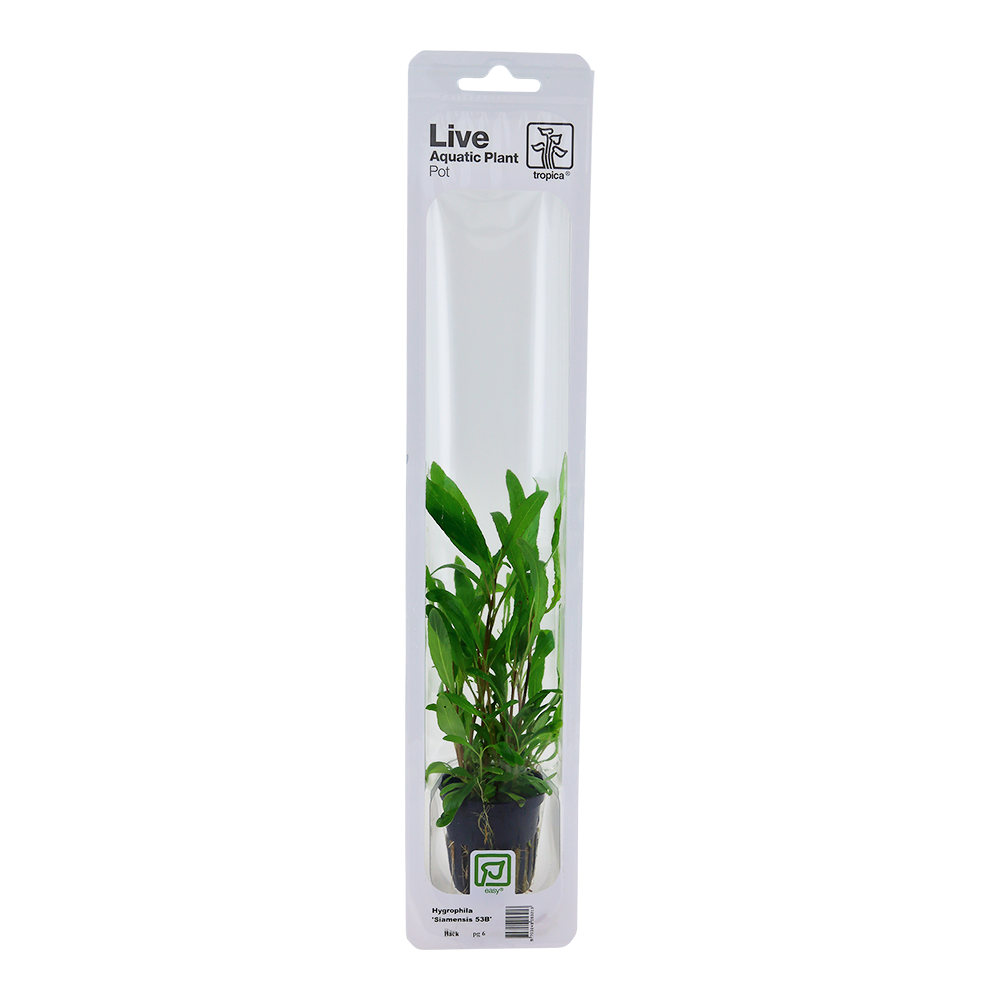 Καλλιεργείται σε μίνι γλάστρα από ίνες καρύδας για να τοποθετηθεί στο ενυδρείο. Συσκευασμένο σε αναπνεύσιμη συσκευασία blister. Η Hygrophila corymbosa ‘Siamensis 53B’ είναι μια ποικιλία της Hygrophila corymbosa ‘Siamensis’. Αυτή η Hygrophila ‘Siamensis 53B’ σχηματίζει έναν απίστευτο αριθμό πλευρικών βλαστών και γίνεται θαμνώδης σχετικά γρήγορα. Οι βλαστοί της φτάνουν τα 15-40 cm σε ύψος και τα 7-12 cm σε πλάτος. Τα όμορφα φωτεινά πράσινα φύλλα της είναι στενότερα από τα κανονικά ‘Siamensis’ και μπορεί να αποκτήσει κόκκινα-καφέ φύλλα σε καλές συνθήκες φωτισμού. Ένα μη απαιτητικό, ταχέως αναπτυσσόμενο φυτό που πρέπει να κλαδεύεται συχνά για να διατηρηθεί μια θαμνώδης ανάπτυξη.