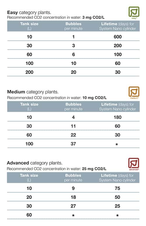 Ο πίνακας απεικονίζει προτεινόμενη δοσολογία(φυσαλίδες ανά λεπτό)σε διαφορετικά μεγέθη ενυδρείων.